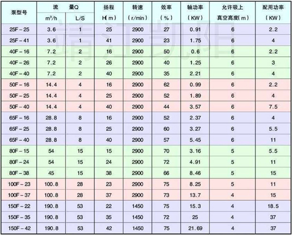公司现在生产的F型系列(FB、AFB、AFK)耐腐蚀泵规格及性能参数请看下表。