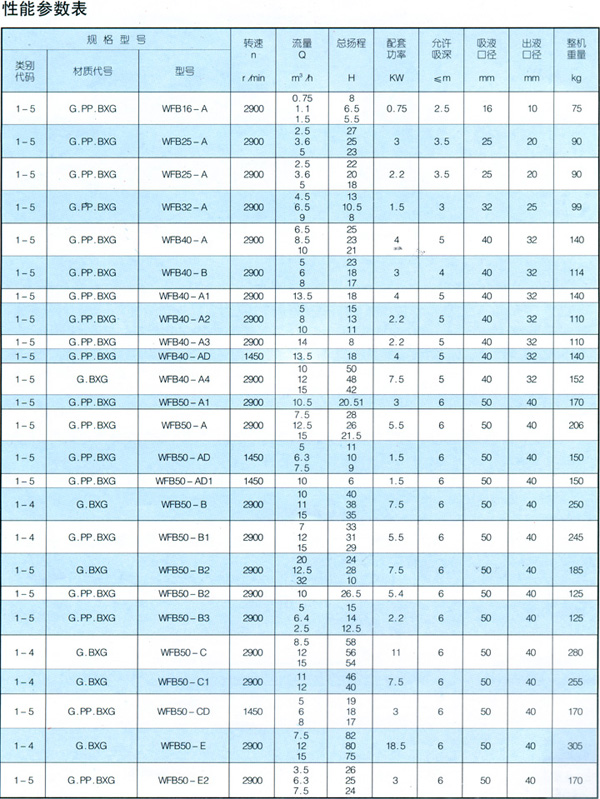 (3)完整的型号书写方式。假设水泵的要求是:造型为推车移动型,材质为增强聚丙烯,吸液口径为40mm。性能为AD1。这台水泵的完整型号为“5PP40WFB-AD1”。