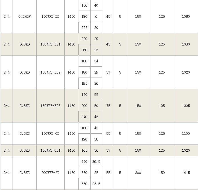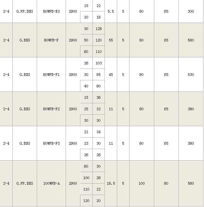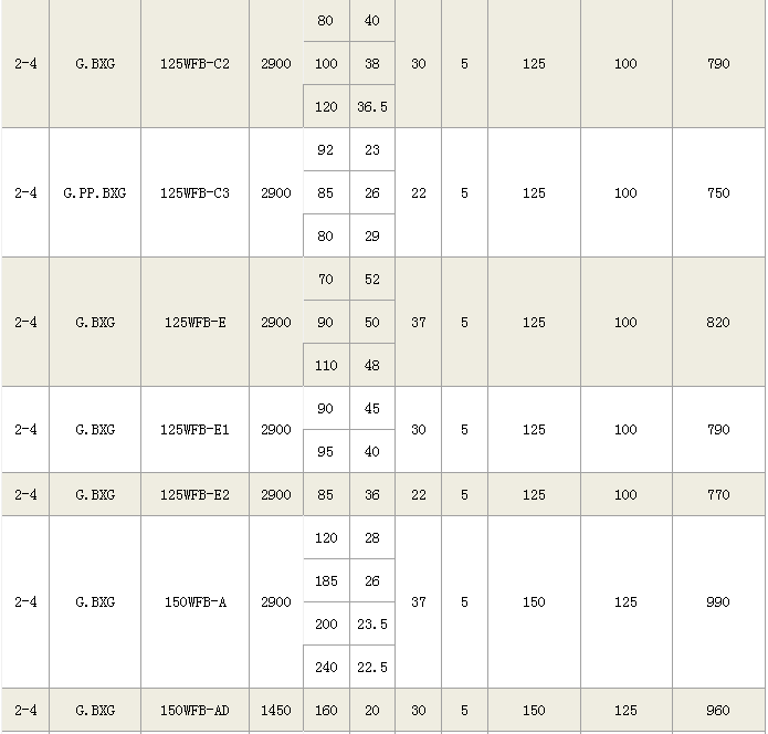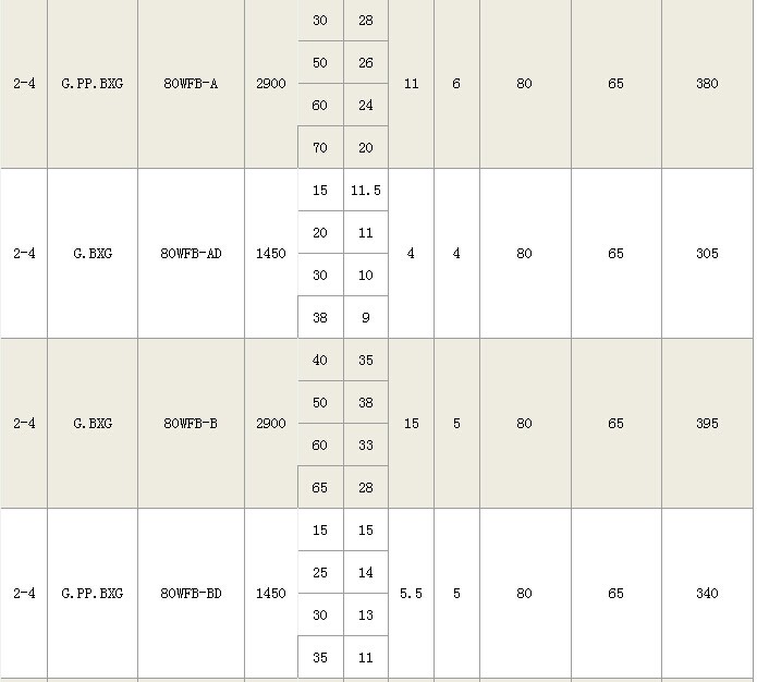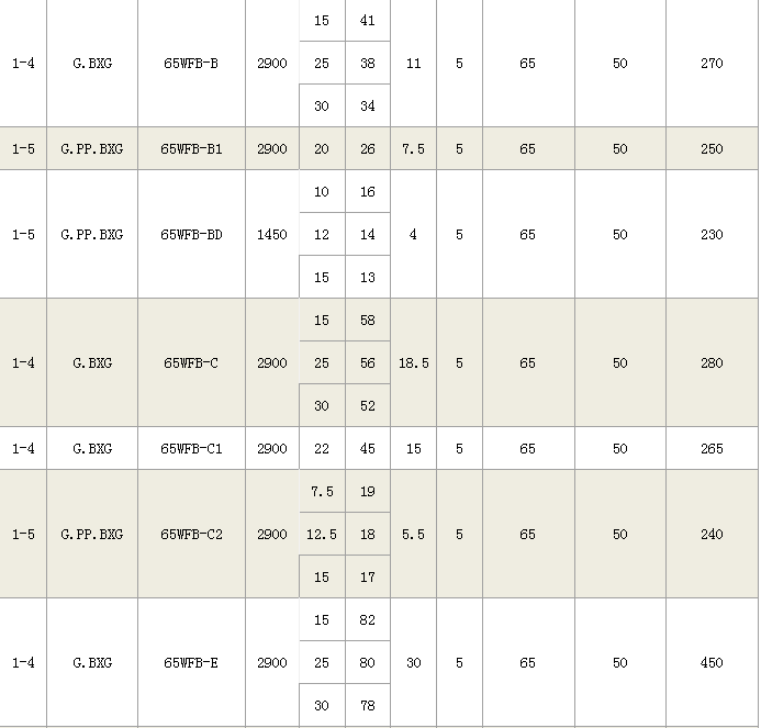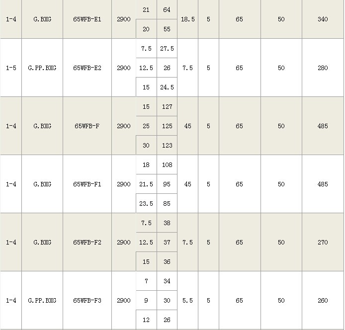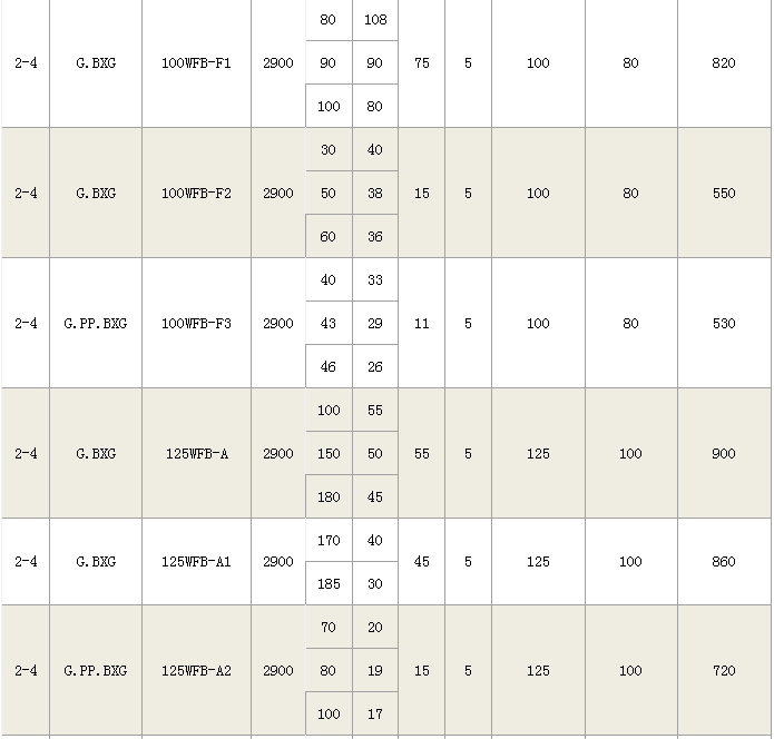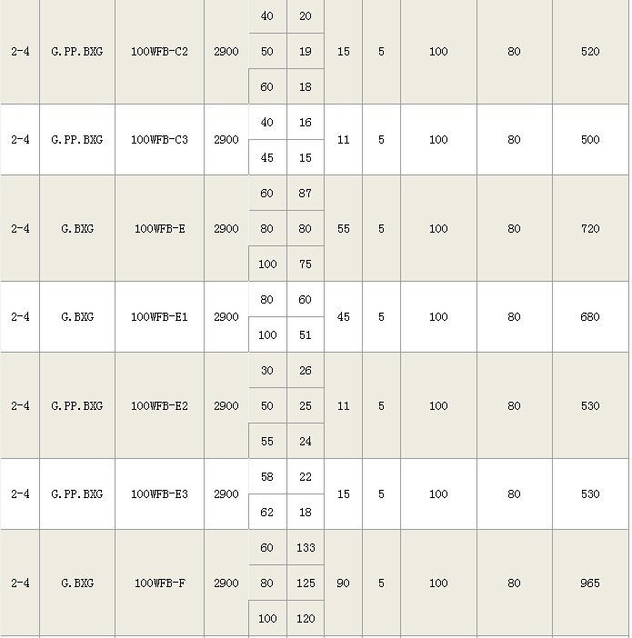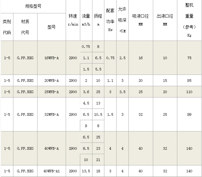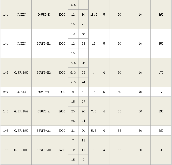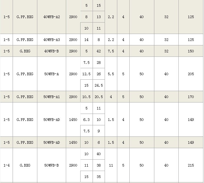 (3)完整的型号书写方式。假设水泵的要求是:造型为推车移动型,材质为增强聚丙烯,吸液口径为50mm,性能分类为AD1。这台水泵的完整型号为“5PP50WFB-AD1”